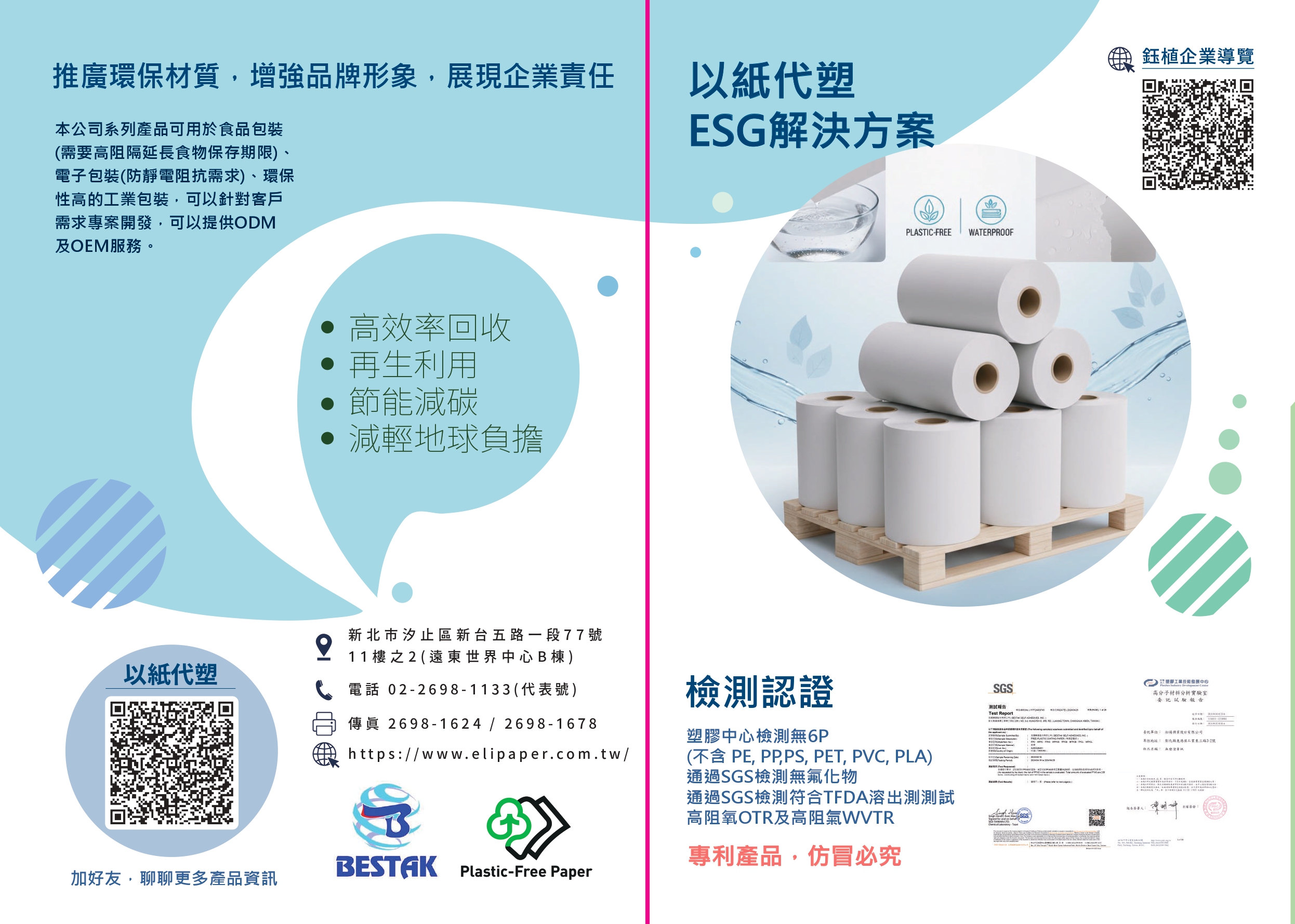 鈺植企業(ELIPAPER)憑藉多年紙材專業與塗佈技術,推出無塑紙系列產品,提供兼具環保與機能性的包裝解決方案,協助企業在ESG浪潮中建立競爭優勢。
